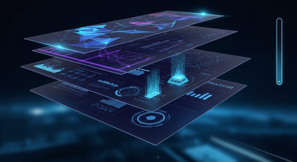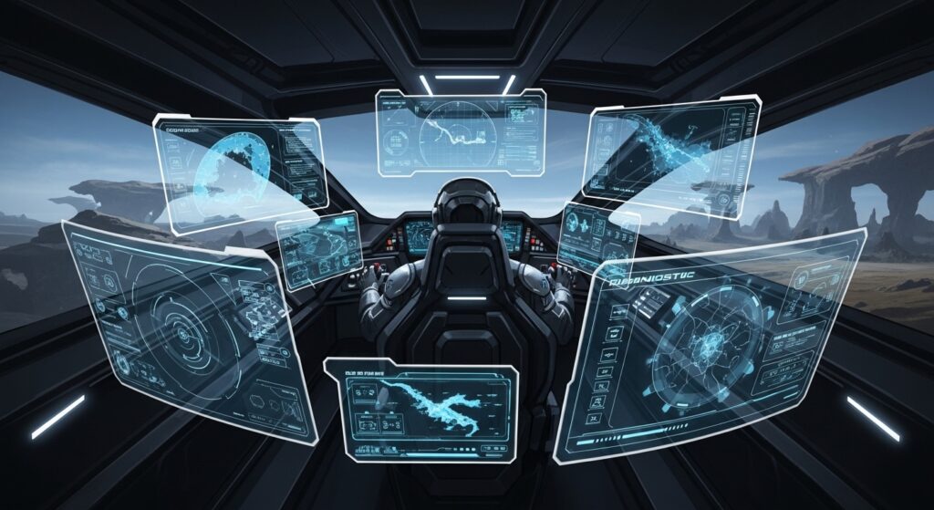 This involves designing graphical user interfaces that appear to float in space, often using transparency, light emission, subtle noise/grain, and depth-based blur. Elements have a layered, ethereal quality, often seen in sci-fi movies. Implementing this in games or interactive media creates a powerful sense of being inside a multi-dimensional interface.