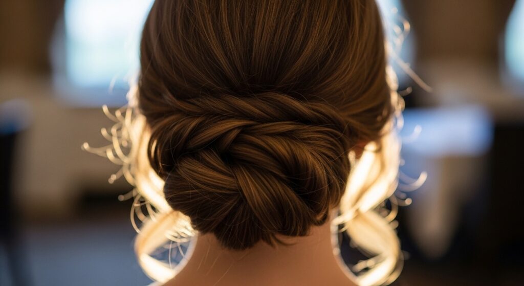 3. The Rope-Twist & Knot: Create a low side ponytail. Twist the entire ponytail tightly until it begins to coil back on itself. Then, instead of pinning it into a standard bun, tie the twisted rope into a single, large, loose knot right at your neckline and secure with pins. Let the ends flow out softly.