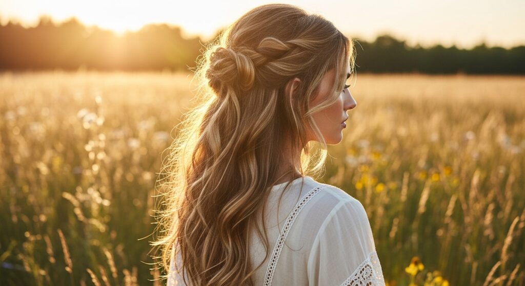 4. The Boho Half-Up Crown: Take two front sections from each temple. Tie them into a single knot at the back of your crown, leaving the ends free. Pull slightly to loosen the knot for a soft effect. This creates an instant, minimalistic crown detail.