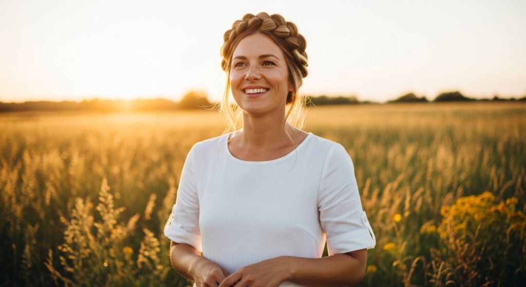 Can’t commit to a full updo? The half-up milkmaid is the perfect compromise. Create two small braids starting at your temples, but only bring them to the back of your crown and pin them there, letting the rest of your hair flow freely. This gives you the cute crown detail of the milkmaid style while still enjoying the breeze on your lower neck. It’s ideal for days when you want a touch of style without the full commitment.