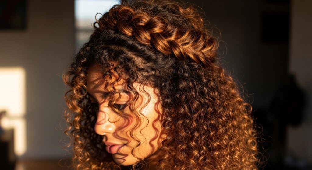 If you have natural curls or waves, your milkmaid braids will be absolutely show-stopping. The texture gives the braids incredible volume and a romantic, organic feel. Braid your hair while it’s slightly damp or use a styling cream to define your curls within the braid. Don’t worry about flyaways—they’ll only add to the charm. Once pinned, gently pull apart the braids for a cloud-like, ethereal crown.