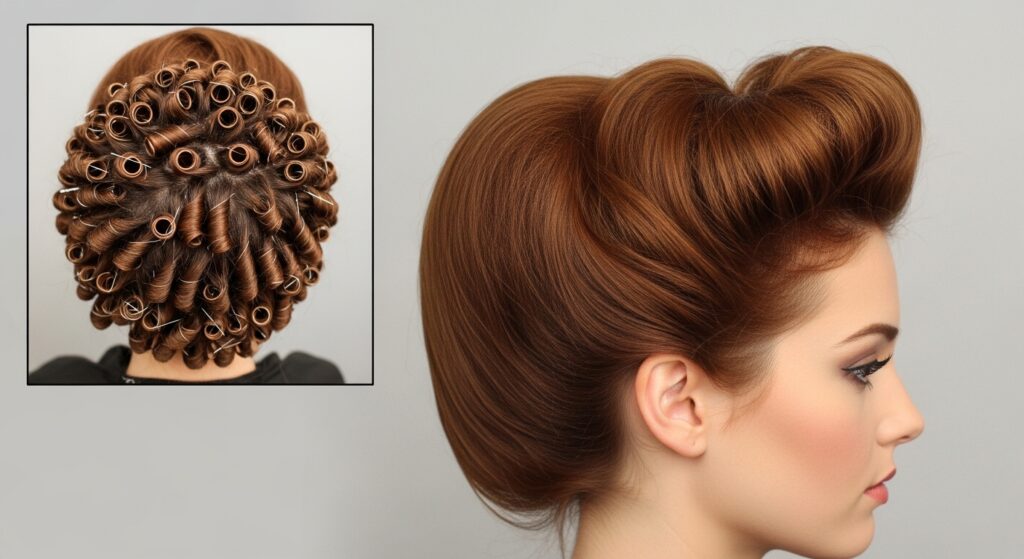 For incredible volume, create a row of stand-up pin curls directly down the center of your head from forehead to nape. Once set and brushed out, this gives massive height and a solid foundation for victory rolls or big hair styles.