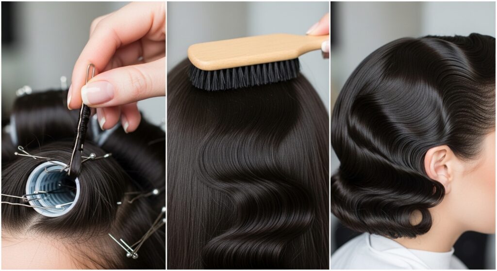 Your work isn’t done when the pins come out! The brushing-out process is crucial. Start by carefully removing all pins. Using a soft-bristle brush or a wide-tooth comb, gently brush through the curls in a downward motion. Don’t rake through aggressively—you’re separating and shaping the waves, not brushing them straight. Use your fingers to help sculpt and place the waves. Once brushed, mist lightly with a flexible-hold hairspray. For authentic 1940s style, you can then use your fingers or a comb to create a sharp side part and define individual waves.
