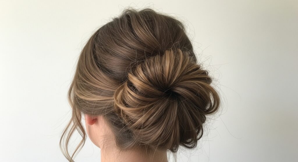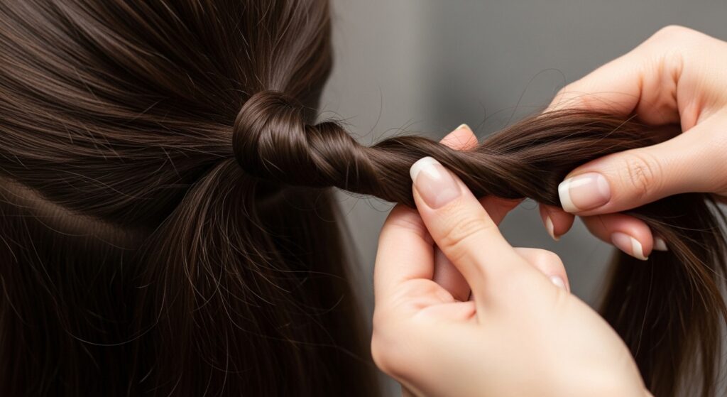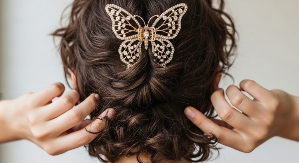 For those avoiding any tension from ties, use a large, jaw-style clip or a butterfly clip. Gather your hair at the top of your head, twist once loosely, and clip it in place. This method is quick, eliminates any line or dent from a tie, and is great for fine hair that marks easily.