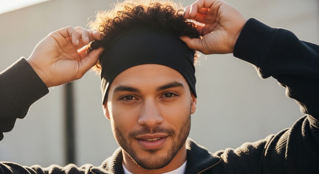 Shorter curly hair on men can also benefit! Using a large, stretchy silk headband, gather the front and top hair upward and back, almost like a very loose, mini pineapple. This preserves the shape on top while the sides are protected by a satin pillowcase.