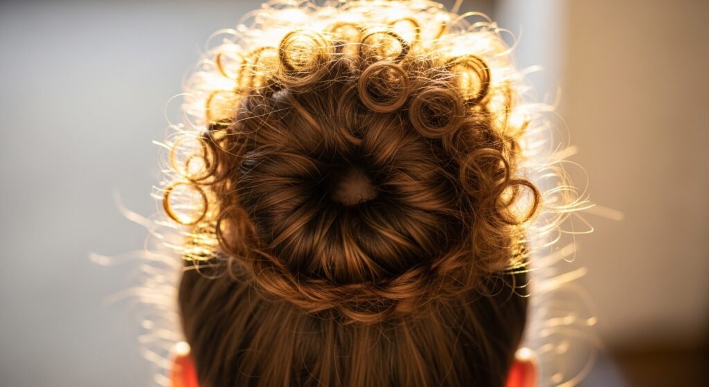 This is the number one secret for a bun that looks full and intentional, rather than small and tired. Once your bun is secured, gently pull apart the curls in different sections to widen and flatten them slightly—like you’re making a pancake. Start from the outer layers and work your way in, being careful not to pull the bun completely out. This technique maximizes the visual volume of your curls, making your bun look bigger, bolder, and beautifully defined.