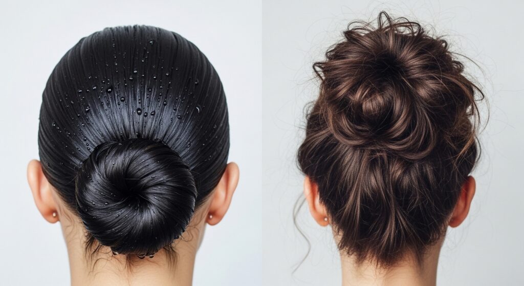 The state of your hair when you create the bun dictates the final result. A bun made on soaking wet hair with gel will dry into a solidified, cast-like shape with intense definition and a sleek look. A bun made on dry, day-two or three hair will be much softer, frizzier, and more romantic. Try both to see which look you prefer for different occasions.