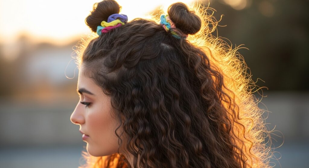 Why commit all your hair? A half-up, half-down style is a fantastic way to enjoy the bun while still showing off the length and volume of your curls. Gather only the top section of your hair into a small, often higher, bun. This keeps hair out of your face while letting the rest of your curls cascade down your back, offering the best of both worlds.