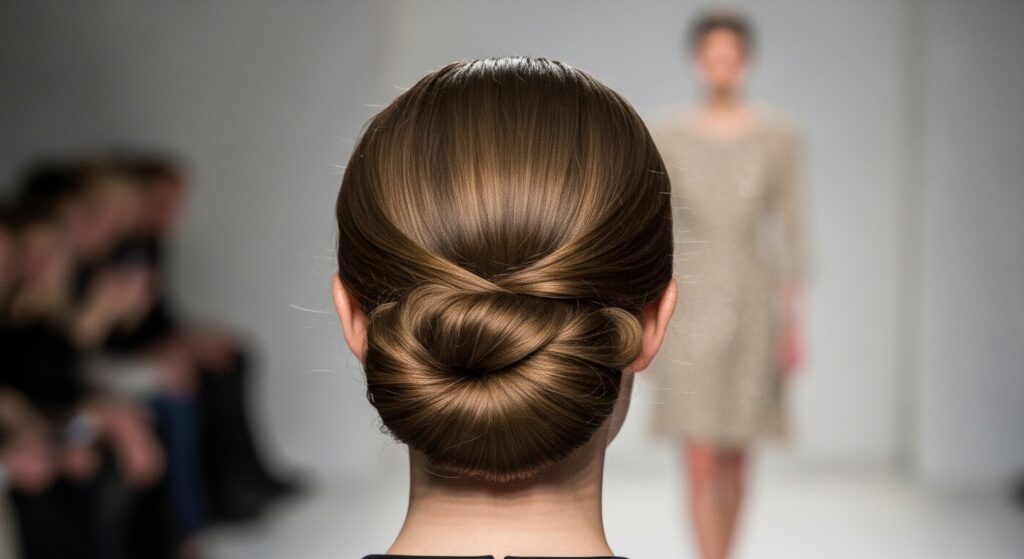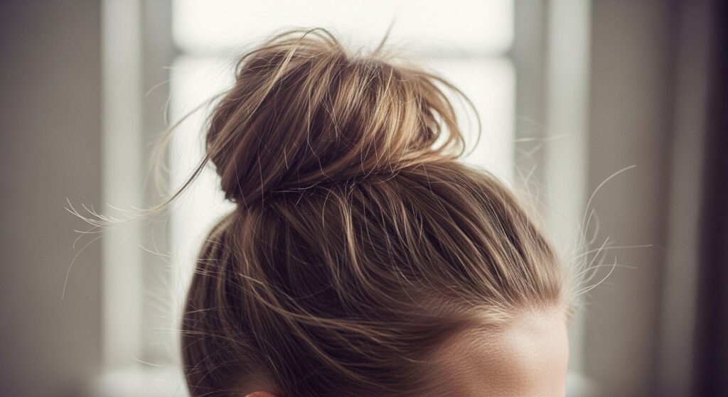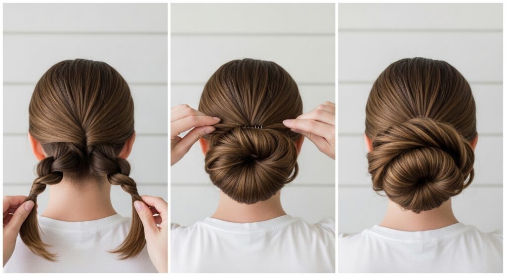This method builds volume horizontally across the back of your head. Take two sections of hair from behind your ears and twist them back towards your crown, securing them loosely where they meet. Gather the remaining hair, including the twisted sections, into a low bun. The twists act as anchors, creating width and the illusion of thicker hair before the bun even begins.