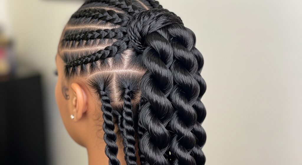 Rope twists add visual interest and thickness to each strand. Divide your ponytail into two sections. Twist each one tightly in the same direction, then twist them around each other in the opposite direction. Secure the end. This technique binds the hair together in a way that looks and feels denser than a simple tail, and it holds texture beautifully.