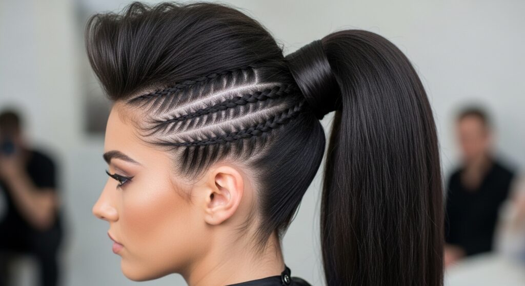 Similar to the braided crown base, but for a ponytail. Create two small Dutch or regular braids starting at your temples, going back into your ponytail placement. Secure them with the rest of your hair into a mid-high ponytail. The braids add grip, detail, and most importantly, lift at the front and sides, giving your pony a built-in volume boost.