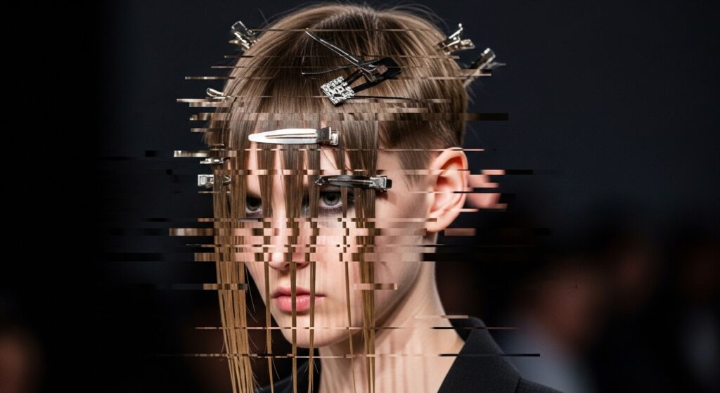 Leave other sections loose to waterfall down. The contrast between the pinned-back pieces and the falling pieces creates that cool, “glitchy” effect. It’s artistic and easy.