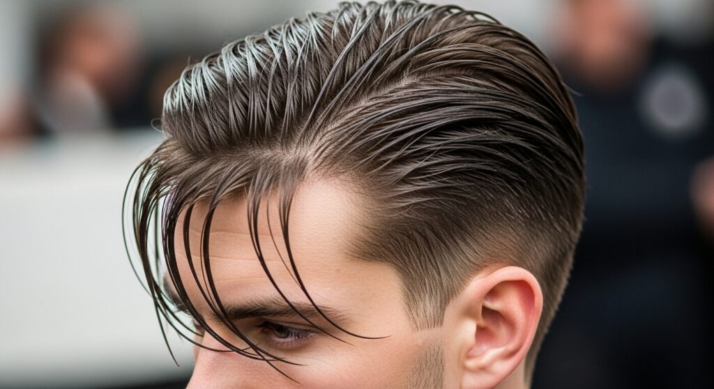 Apply a strong-hold gel to damp hair. Use a comb to slick back the hair from your temples and crown. But here’s the twist: leave your front sections or bangs free.
