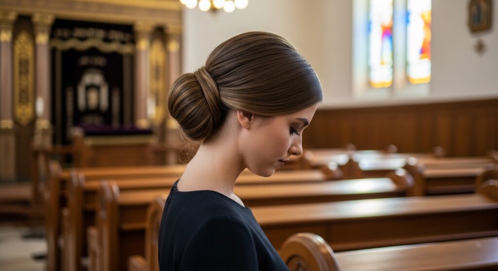 In many Reform, Conservative, and egalitarian communities, it is common for women to wear a kippah (yarmulke) during the religious service. Planning a hairstyle that accommodates a kippah is a thoughtful and practical step. Many choose hairstyles that have enough volume or texture on the crown to securely hold a kippah clip without slipping. Half-up styles, braided crowns, and fuller updos often provide the best anchor. There are also beautiful, feminine kippot designed with lace, beads, or embroidery that can be chosen to complement the hairstyle and outfit. Discussing this with your rabbi or cantor is always recommended to understand the customs of your specific congregation.