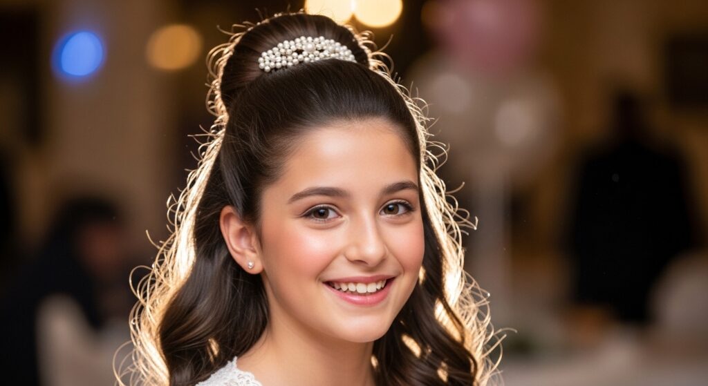 The half-up, half-down style masterfully captures the duality of the Bat Mitzvah experience. It is the perfect harmony between the formal and the festive. This style keeps hair away from the face for the service, ensuring a clear and focused presence, while allowing beautiful locks to flow freely for the dance party. Elevate the basic half-up style by adding a braided element to the crown section, or pulling back the sides with two small, twisted sections that meet at the back. This style is also the perfect canvas for accessories, from a delicate crystal clip to a clip-in piece that adds a pop of color or sparkle.