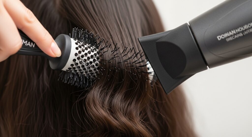 10. Tension Blow-Drying: Use a Denman brush or a wide-tooth comb. Take a small section, place the brush under the hair, and point the nozzle down the hair shaft, following the brush. The tension from pulling the brush and the directed airflow smooths the cuticle.
