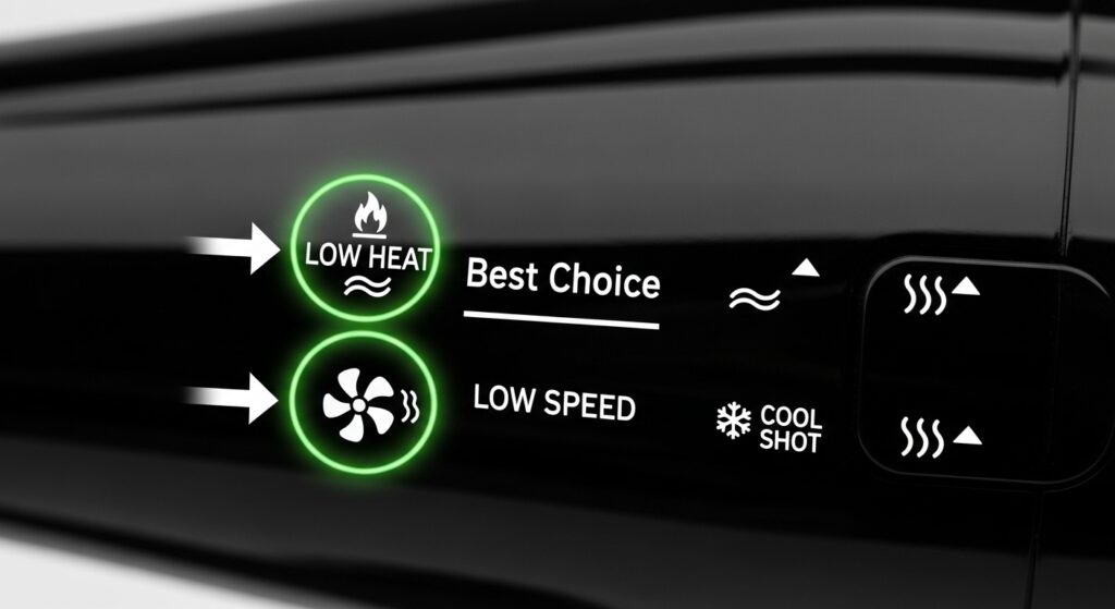 14. The Progressive Dry: Begin on medium heat and low speed to remove bulk moisture. As hair becomes damp (not wet), switch to low heat. For the final dry, use the cool setting.