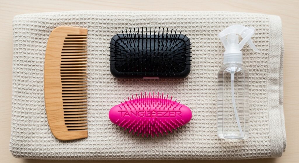 Detangling Brush (Flexible Paddle or Tangle Teezer-style): These have flexible, varying-length bristles that bend to navigate knots. They are often more efficient than wide-tooth combs for thicker, denser hair but should still be used on conditioned, wet hair with the bottom-up technique.
