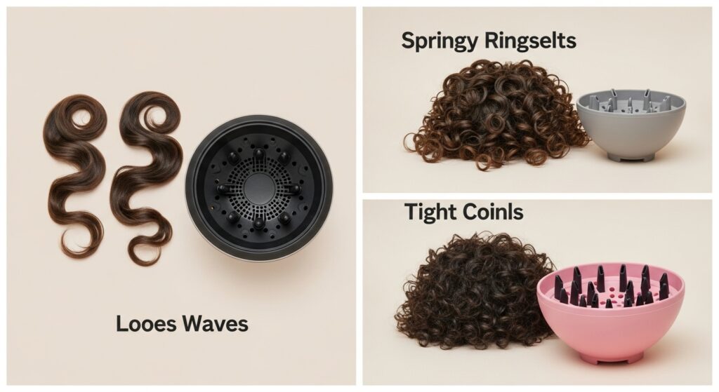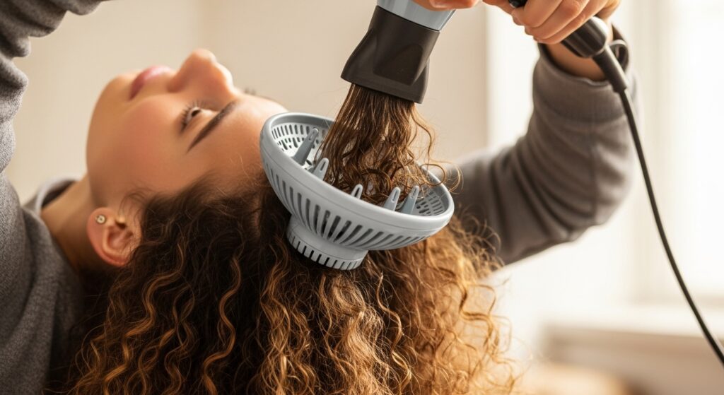 15. The “Diffuser Attachment Tuck”: For tighter spring, gently tuck individual curl clumps into the diffuser prongs (if your diffuser has them) while using the Cup & Hold method for enhanced spiral formation.