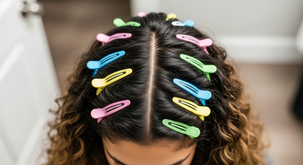 As you diffuse sections, use duckbill or claw clips to pin the dried roots up while you work on other sections. This provides instant volume lift that sets as the hair cools.