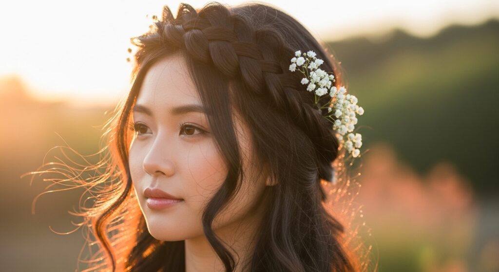 The Boho Braid Crown: This isn’t just for festivals. A braid crown, whether using a single braid wrapped around the head or two braids intertwined, creates a regal yet relaxed vibe. Leave out some soft waves around your face for a touch of effortless romance.