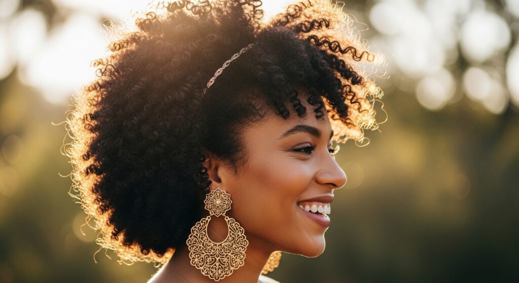 Defined Curly Fro: Celebrate your natural volume and shape. With the right defining cream and diffuser, your afro can be the stunning, statement-making centerpiece of your look. Add a pretty headband or delicate crown for a touch of festivity.