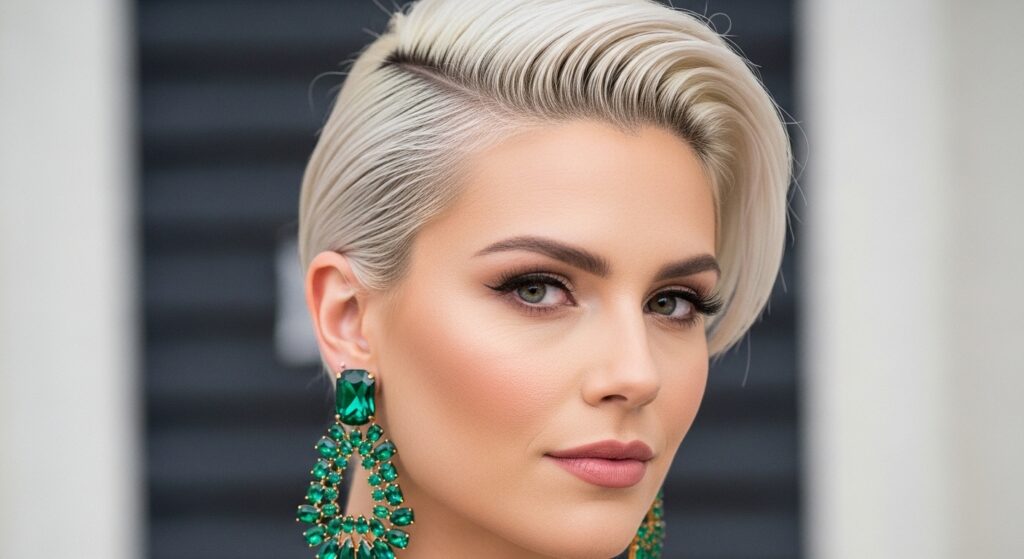 Sleek Pixie with a Statement Earring: Play up a sharp, sleek pixie cut with a bold side part and plenty of shine serum. The star here is a stunning pair of statement earrings that you can now show off in all their glory.