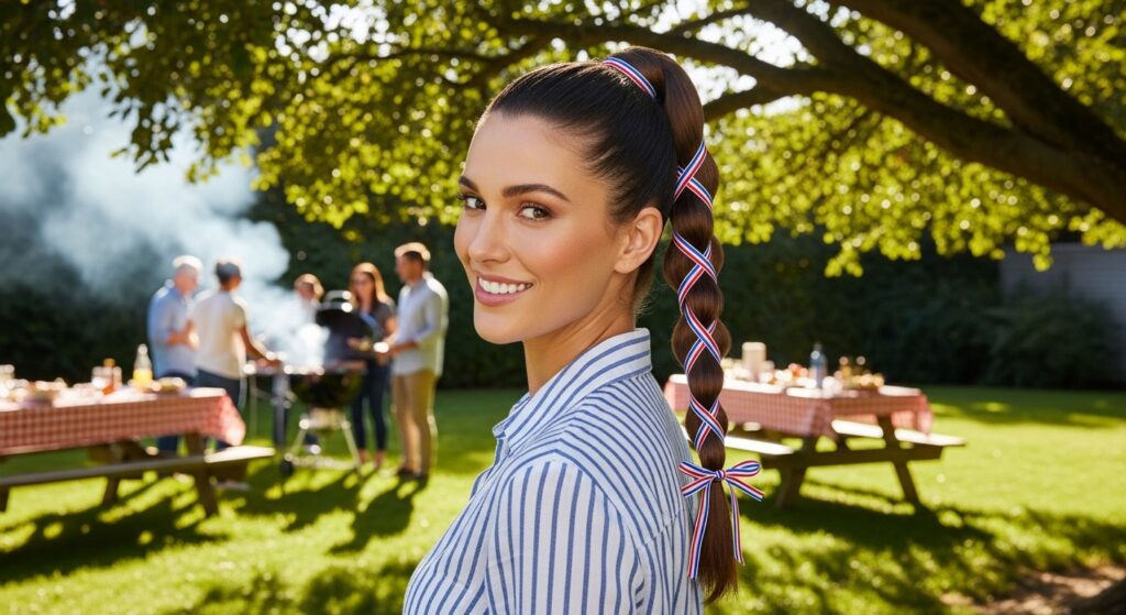 The Classic Patriotic Ponytail: Elevate a simple high or low ponytail by weaving in thin ribbons in red, white, and blue. Secure the ribbons at the base of your ponytail and braid them into the hair or let them stream freely for a playful touch.