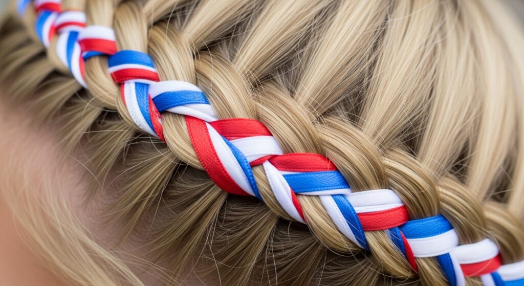 The American Flag Braid: Create a side Dutch braid (an inside-out French braid). As you braid, incorporate small sections of red, white, and blue yarn or ribbon. The finished braid will lay flat against your head, resembling a waving flag.