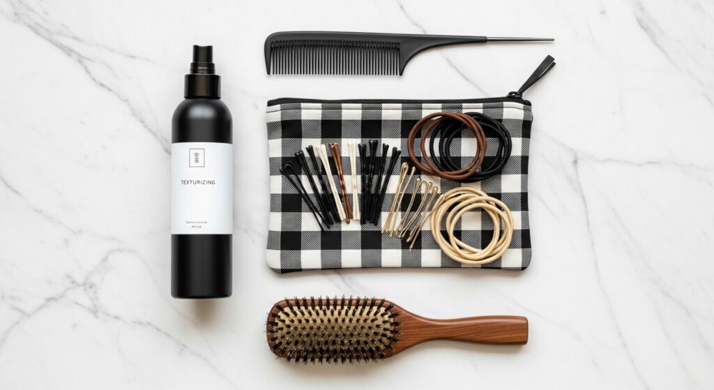 Tools You’ll Need: A fine-tooth comb, tail comb for sectioning, clear elastics that match your hair color, bobby pins (also in a matching shade), a mirror, and light-hold hairspray or texturizing spray. For added grip and volume, a dry shampoo or texturizing powder is a game-changer.