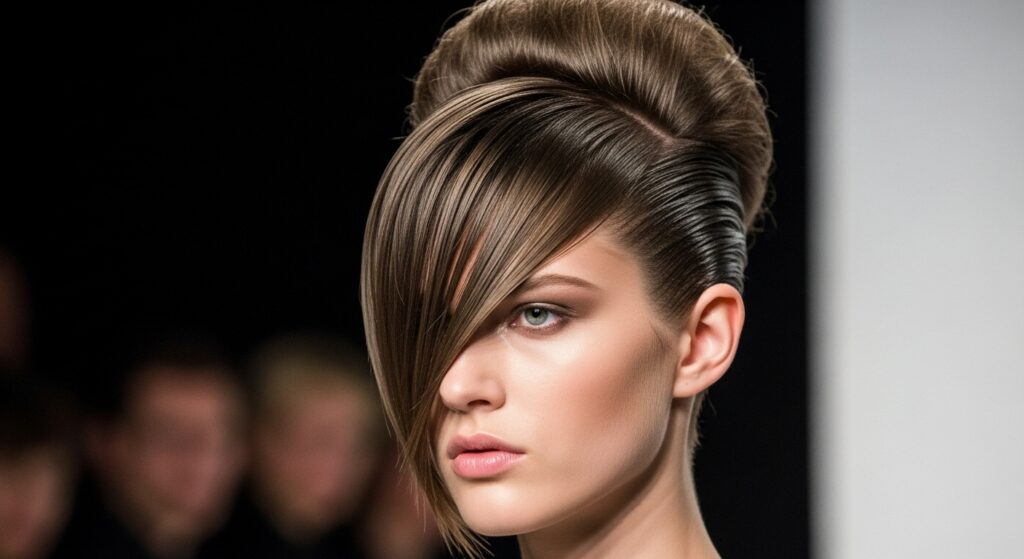 This is not your average top knot. This style is about architecture. Tease your hair for maximum volume, then sweep it into a high, tight bun. Instead of hiding the flyaways, use a strong-hold gel or wax to sculpt the shorter layers into intentional, geometric shapes around your face.