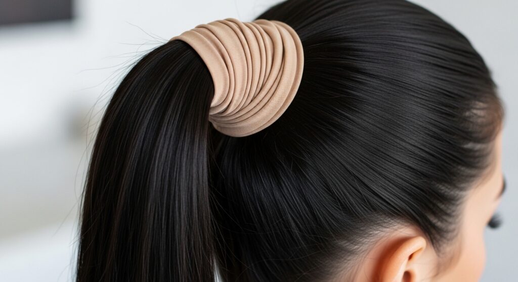 The right tool matters. Snag-free, coil-less elastics (like those from Invisibobble or similar spiral ties) are gentler and create less of a hard dent. For the sleekest look, choose a thin, color-matched elastic that blends into your hair, creating a “second skin” effect where the base of the ponytail appears seamless.