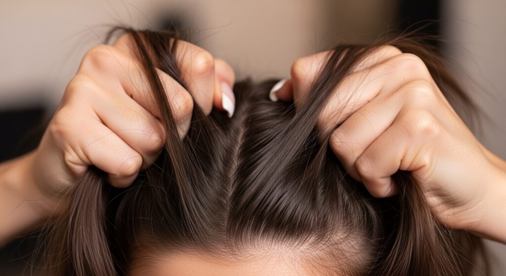 As you gather your hair, use the fingers of your non-dominant hand to maintain strong tension on the top and sides. Pull the hair back firmly and hold that tension as you wrap the elastic. This ensures the hair is pulled taut from the hairline, eliminating any slack that turns into bumps.