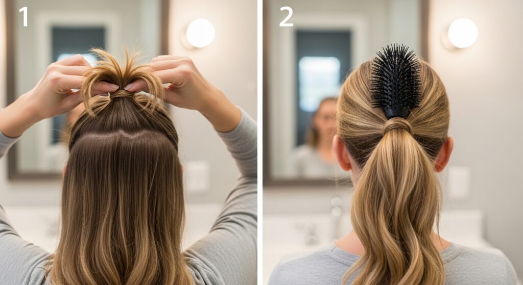 Use two brushes for superior control. First, gather your hair with your hands. Then, use one hand to hold a paddle brush flat against your head to keep the top section smooth, while your other hand uses a second brush to gather the lower sections into the ponytail holder. This prevents the top layer from shifting and creating bumps.