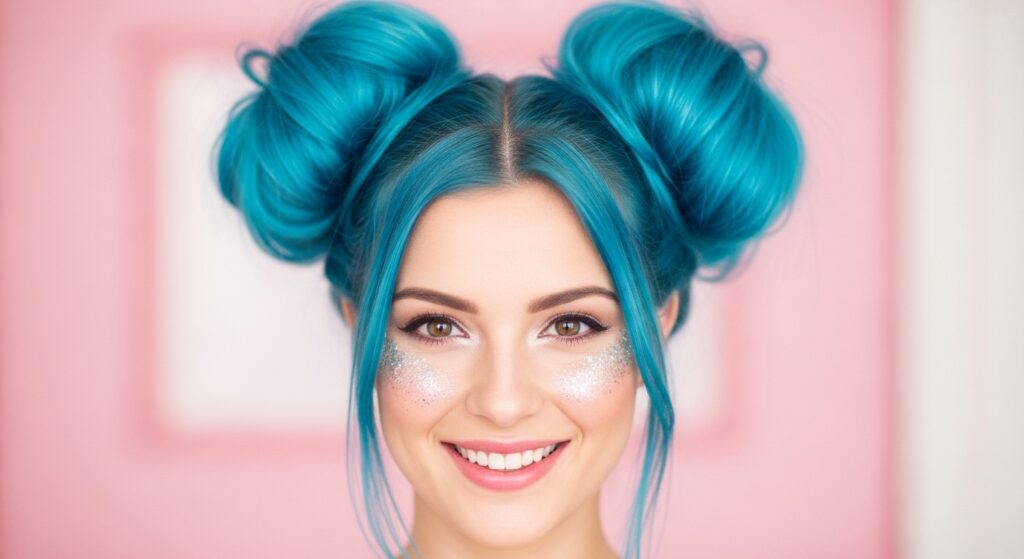 Embrace your playful side with double hybrids. Part your hair down the middle. On each side, gather the hair into a high ponytail and then transform each ponytail into a top knot. Position them high on your head for the classic space bun look, or slightly lower for a less dramatic effect. This style is surprisingly practical, keeping all hair completely secured and off your face.