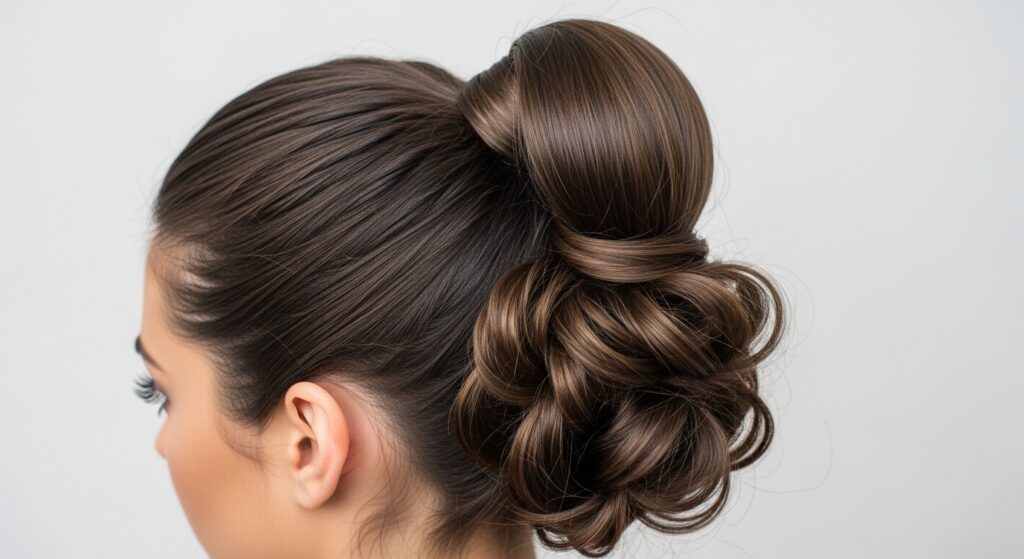 This is the foundational style from which all hybrids grow. Start with a high ponytail, but instead of pulling all the hair through on the final loop of your hair tie, only pull it halfway. You’ll get a looped bun with a tail of hair left out. Gently tug at the bun to create volume and messiness, and let the tail flow freely. The key is in the texture—a bit of dry shampoo or texturizing spray beforehand makes all the difference.