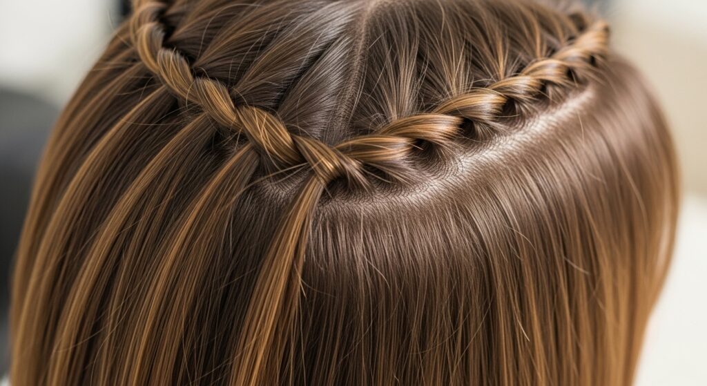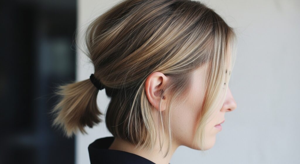This classic style is a lifesaver for angled hair. It neatly contains the top section that’s long enough to tie back while letting the shorter bottom layers create a beautiful, cascading effect. Take a section of hair from the crown of your head, twist it slightly for texture, and secure it at the back with a small, clear elastic. For extra flair, you can pull the ponytail slightly apart to create a mini “pouf” or wrap a small strand of hair around the elastic to conceal it.