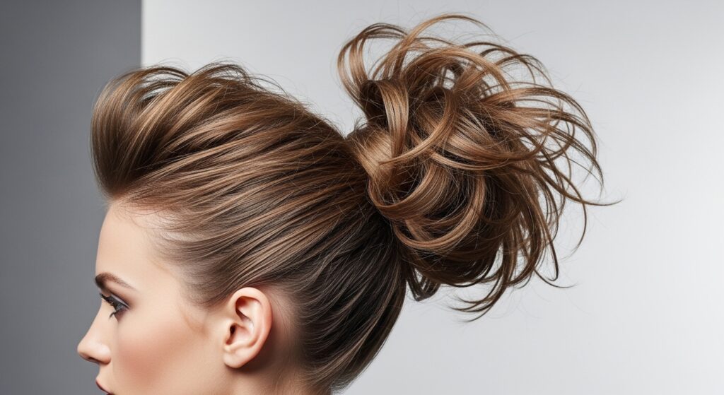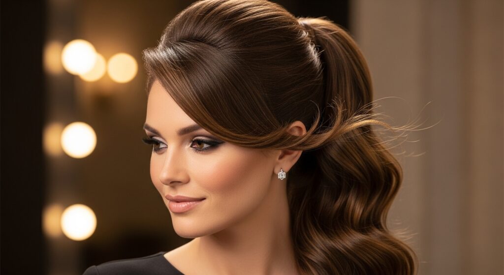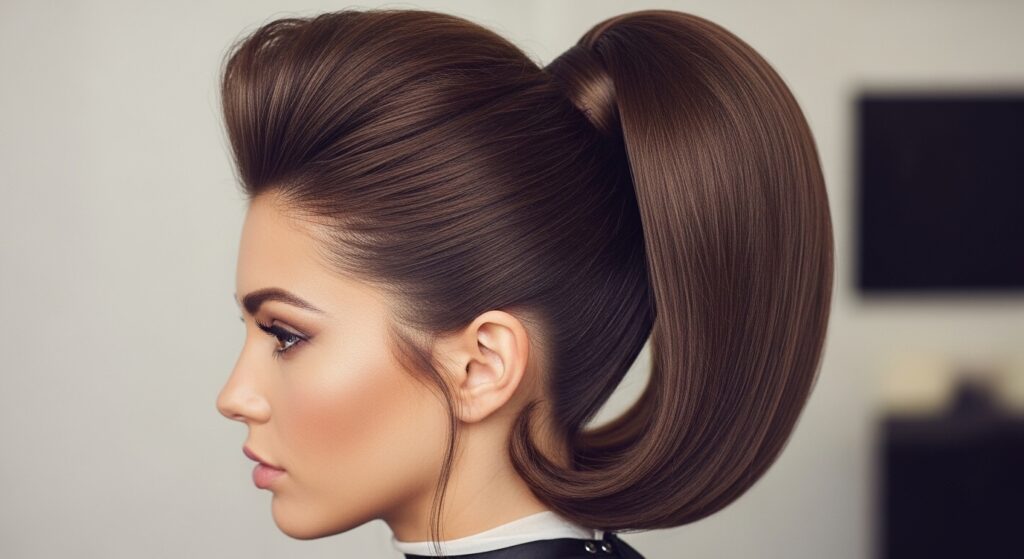 Add a touch of vintage glamour with volume at the crown. Create a deep side or center part. When you gather your hair for a high or mid-height ponytail, gently backcomb the hair at the crown for a bit of lift before securing it. Smooth the top layer over the teased hair to create a soft “pouf.” This extra height balances the angled lines of the cut beautifully.