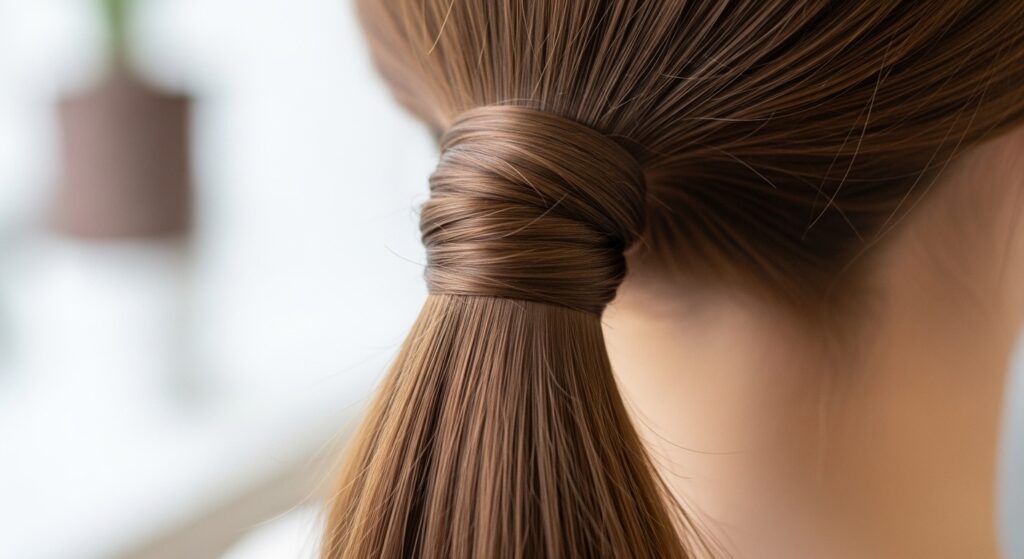 An easy way to add elegance. Create your ponytail. Then, take a small section of hair from the ponytail itself (or use a hair extension) and wrap it around the base to conceal the elastic. Secure the end underneath with a bobby pin. This works for any ponytail height and instantly makes it look more intentional and polished.
