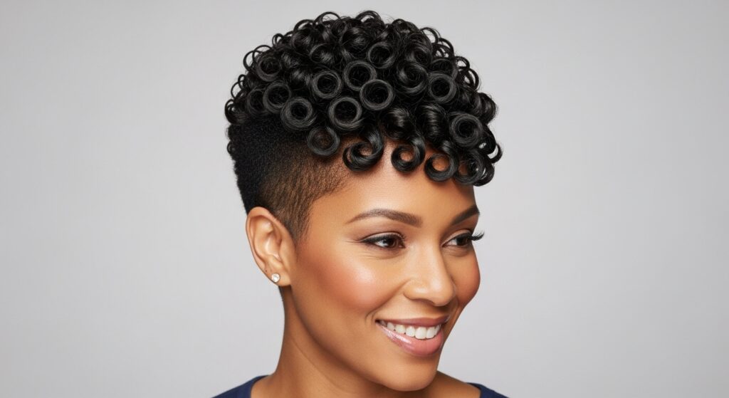 8. Mohawk Style Set: Roll only the hair along the center of your head from front to back, leaving the sides flat or tapered. Once released, you’ll have a bold, curly mohawk style.