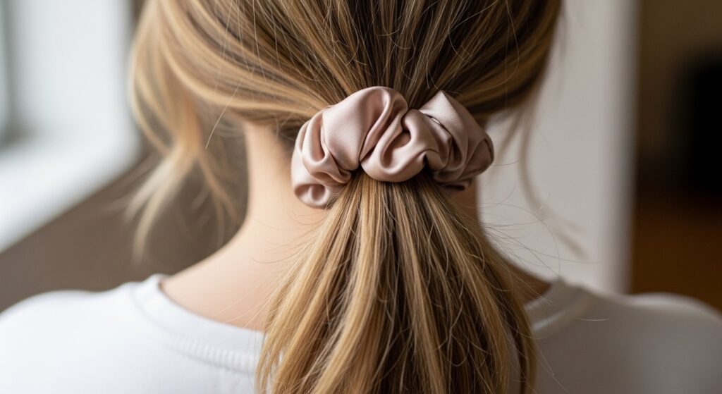 10. Silk Scrunchie Bun: Create a ponytail with a silk scrunchie, then loosely wrap the tail around the base and tuck the end under the scrunchie. The scrunchie acts as both anchor and cushion.