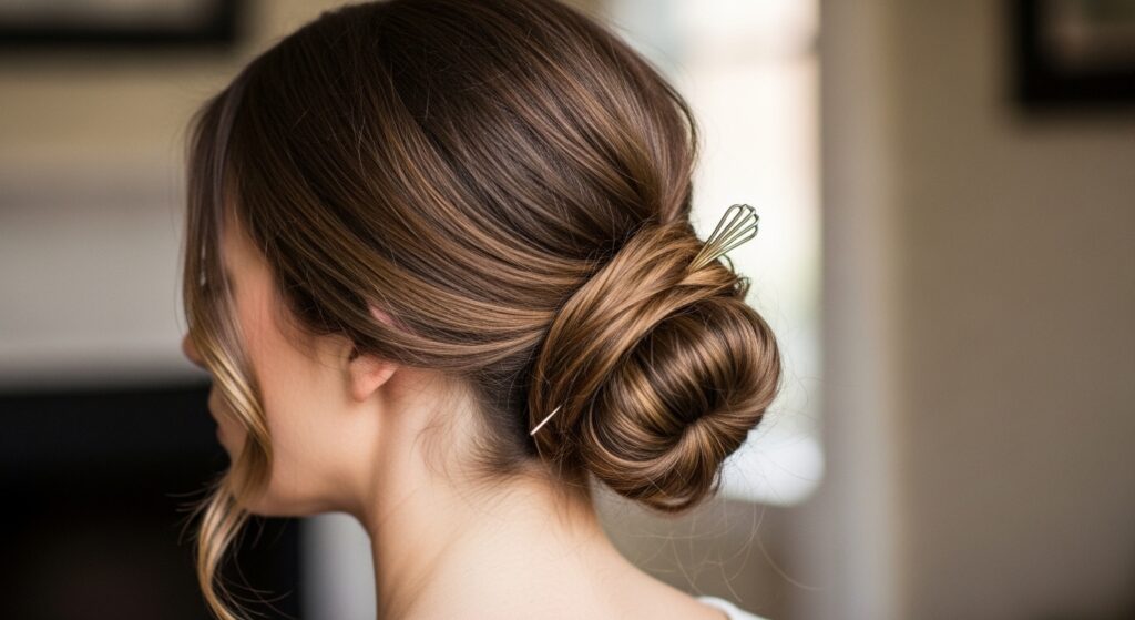 11. Clip-Up Bun: Gather your hair as if for a ponytail, twist it loosely, coil it at the back of your head, and secure the entire coil with 2-3 large claw clips. No elastic needed.
