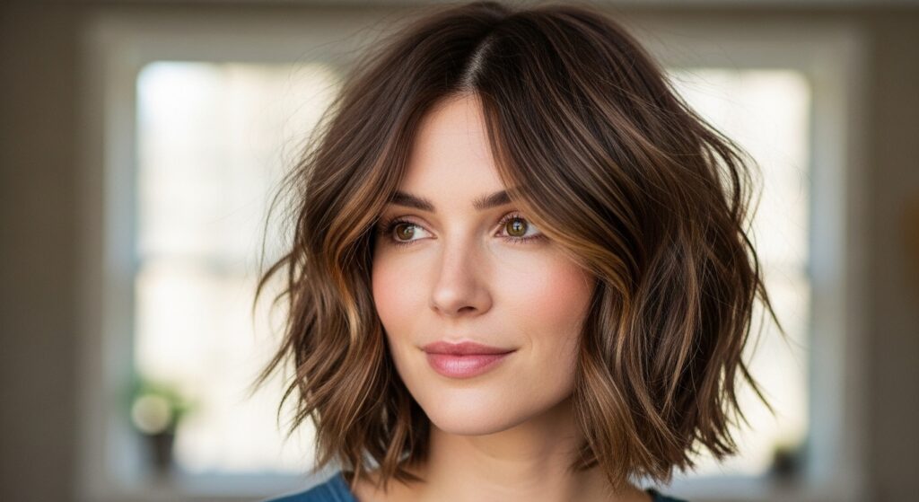 3. The Shaggy Lob (Long Bob): The lob is universally flattering. For square faces, ask for a shaggy version with feathered, face-framing layers that start around the mouth or chin. The internal texture adds incredible movement.