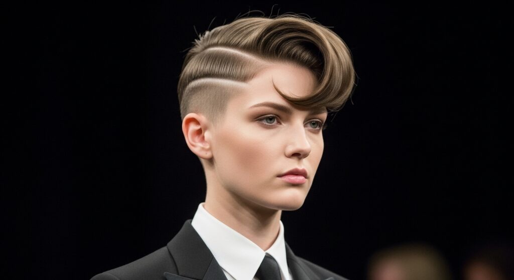 4. The Side-Parted Short Crop: A sleek, side-parted crop with a tapered back and sides keeps the focus high on the cheekbones. The deep part breaks up the forehead’s width.