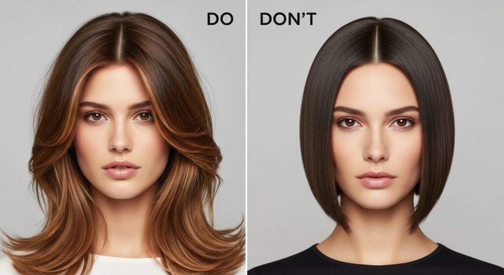 Keep these principles in mind, whether you’re at the salon or styling at home. Seek asymmetry: A deep side part or uneven layers instantly break up symmetry. Embrace layers: They are your best friend, especially those that start at the jawline or below to frame the face. Add volume on top: Height at the crown lengthens the face. Avoid harsh, straight lines: Blunt bobs that end exactly at the jaw can emphasize its width. Instead, opt for texture and movement.