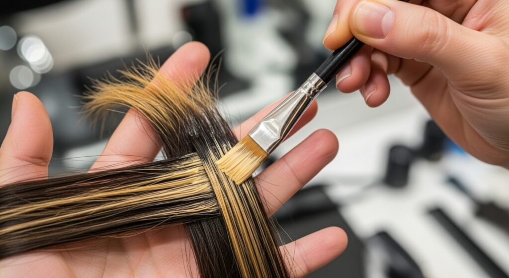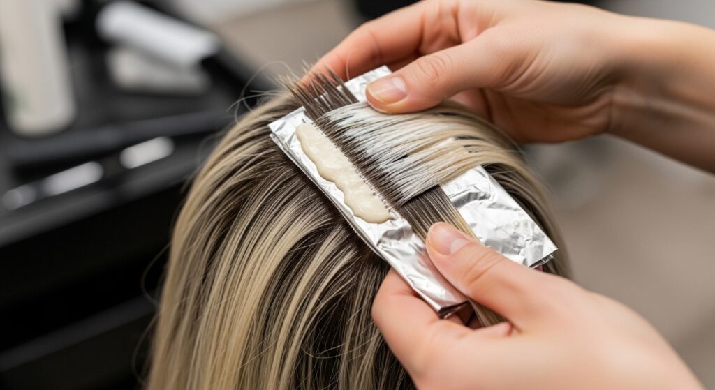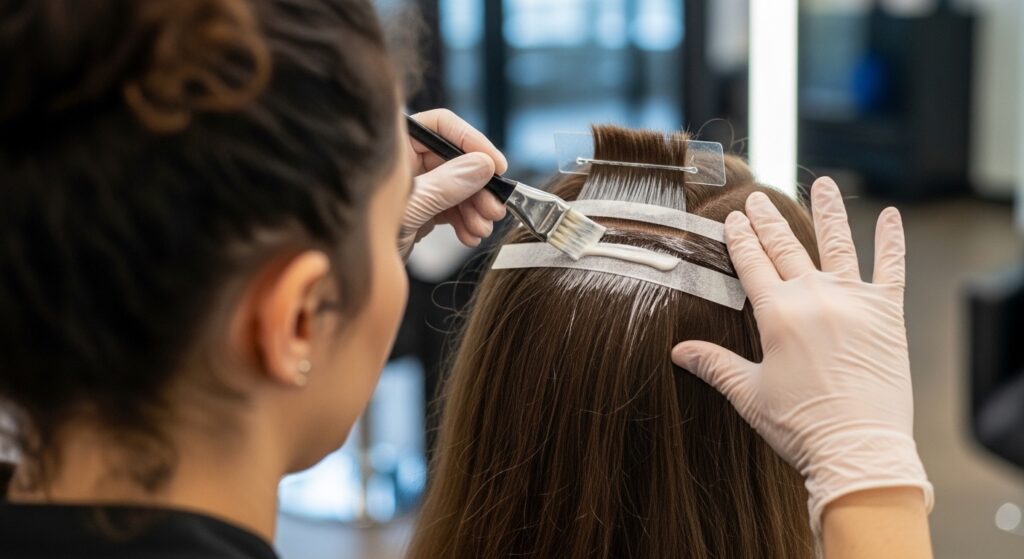 In this technique, a special tape is used to hold the hair while color is painted on. The tape allows for a clean, sharp application and can help speed processing time slightly. It’s a gentle alternative to traditional foiling that can create beautiful, blended results with controlled placement.