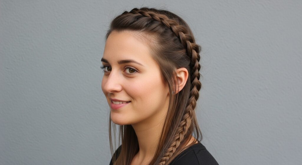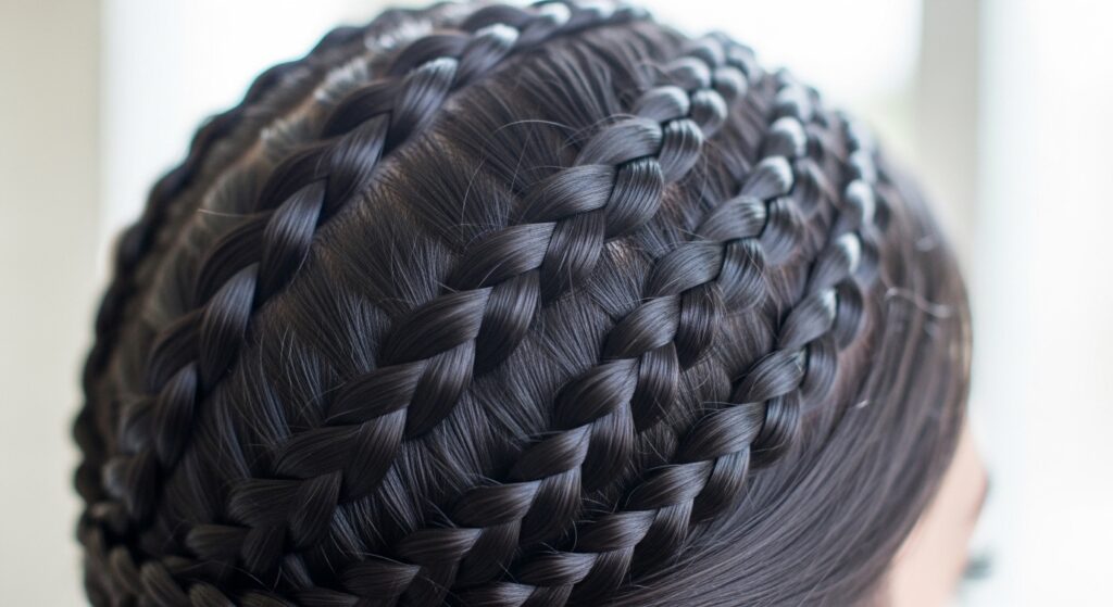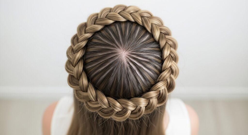 3. The Half-Up Ladder Braid Crown: A beautiful introduction to circular braiding. Create a single ladder braid that starts at one temple and wraps around to the other, securing it for an elegant half-up look.