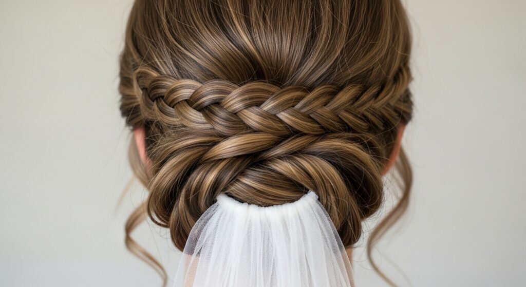 12. Ladder Braid Cathedral Veil Base: A breathtaking style for brides. This updo features a wide, flat ladder braid that sits like a cap at the back of the head, providing a stunning anchor for a veil and intricate bun.