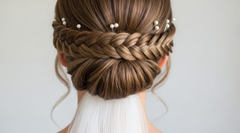 12. Ladder Braid Cathedral Veil Base: A breathtaking style for brides. This updo features a wide, flat ladder braid that sits like a cap at the back of the head, providing a stunning anchor for a veil and intricate bun.