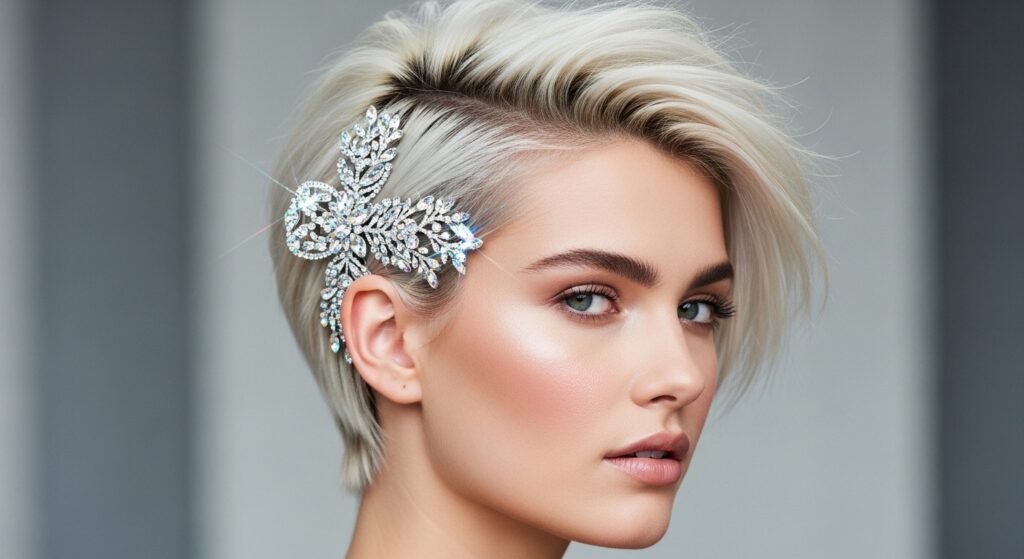 19. Textured Pixie with Sparkle: Use pomade or wax to create piece-y, textured definition. The star here is a dazzling hairpin, comb, or even temporary glitter applied to the side for major impact.